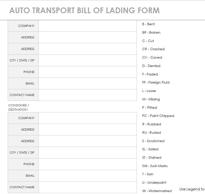 Auto Transport Bill of Lading Form Template EXCEL