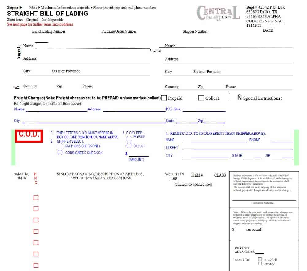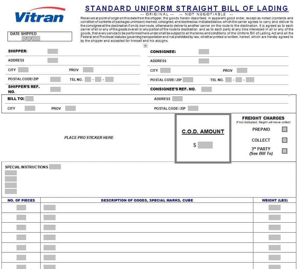 Standard Straight Bill of Lading Template