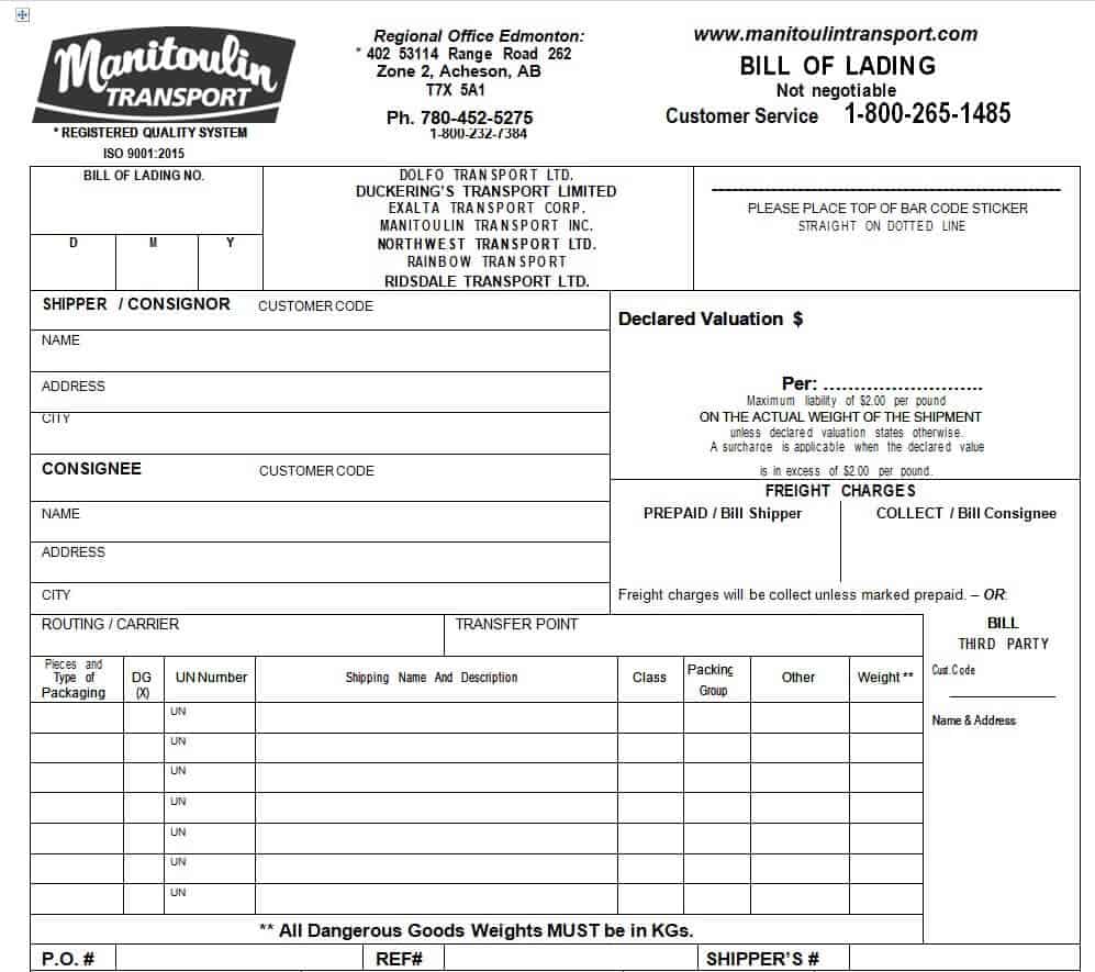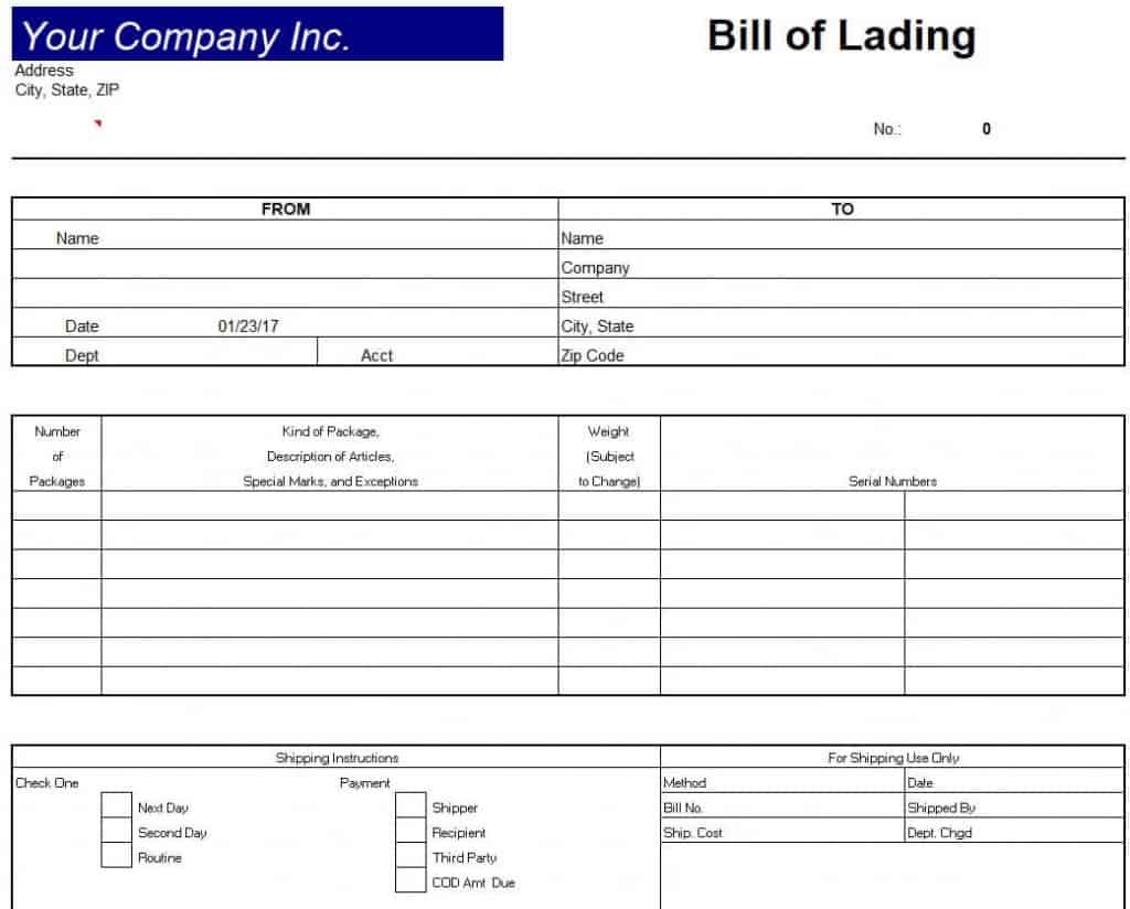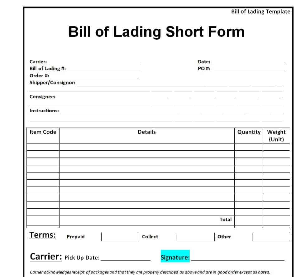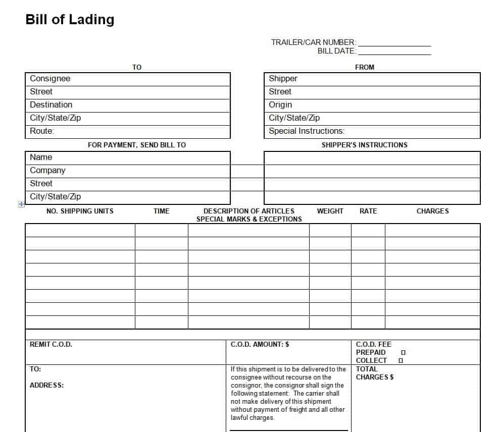 Sample Bill of Lading Template