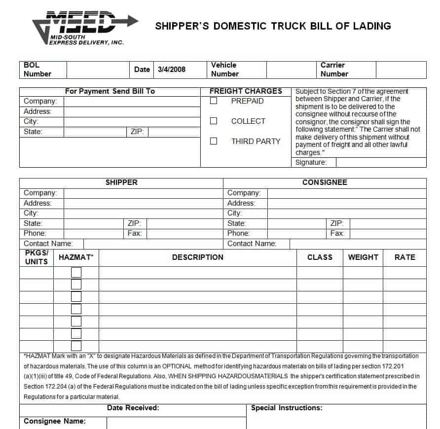 Domestic Bill of Lading Template for Truck