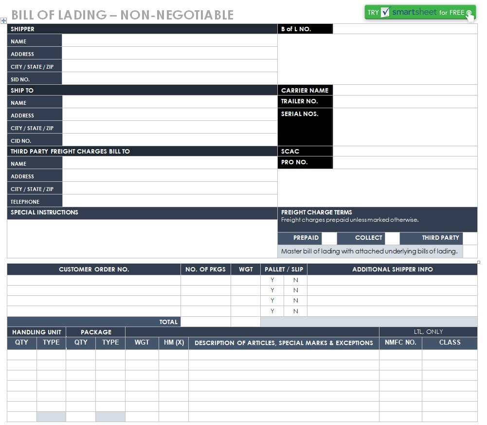 Non Negotiable Bill of Lading Template
