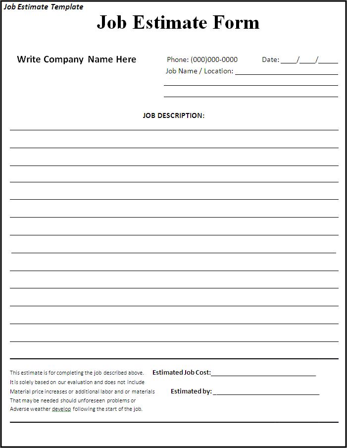 An estimate is a close guess near to the actual value, it may involve some assessments and calculations. A job estimate is simply a primary assessment of a job or project cost. It is very important to prepare a job estimate before starting a job and hiring any person to do the job. It is important to know about all objects and materials to be used in accomplishment of a job in order to prepare an accurate job estimate. You should include brief description about each step of your job in your job estimate. If you are confused and don’t know how to write a job estimate, you should go for internet. A large number of job estimate templates and samples are available on internet for free of cost. You can prepare a job estimate in very short time by using job estimate templates.