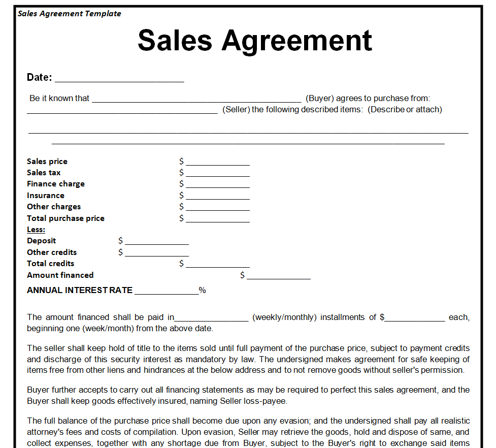 The document which shows the relationship between the buyer and the seller is known as a sales agreement. Both parties have to be on the terms and conditions settled during the agreement. The sales agreement can be about an asset or a product. The buyer and the seller are secured due to this agreement. The details in the sales agreement include the name of the product, either cash or credit sale. The duration of paying the amount is mentioned on the sales agreement made on credit. The sale is of two types1-conditional sale2-execution sale. A sale in which the buyer receives the title to the property only upon the performance of some condition. A sale of property by the sheriff under the authority of the court’s writ of execution in order to satisfy an unpaid obligation.